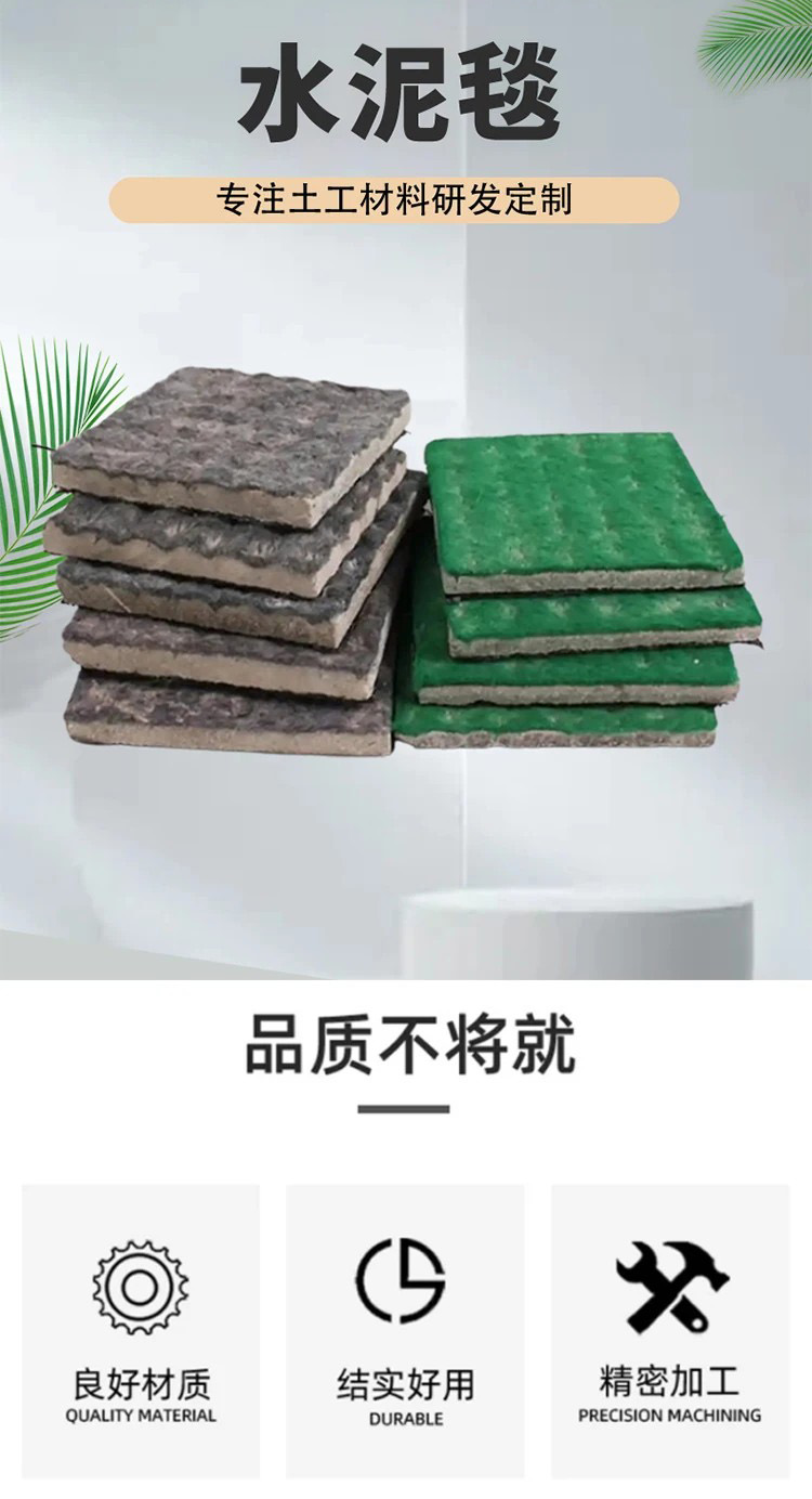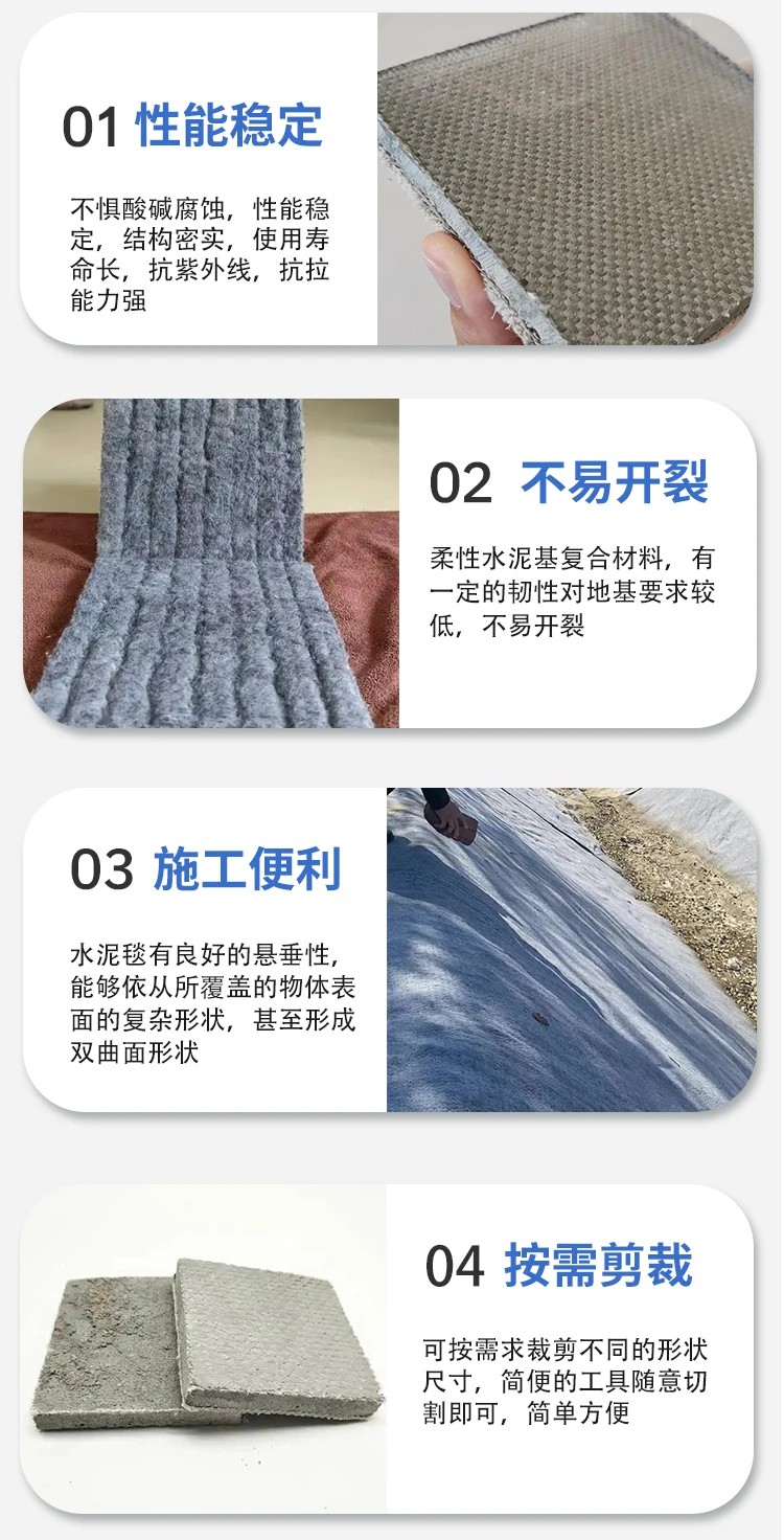 水泥毯是一种新型环保生态复合防水防渗材料, 它由吸水保护层、混凝土填充层(包括一层加筋增强层)和保湿层, 利用针刺出的纤维骨架或者缝合复合在一起,就形成了一种柔性 混凝土复合垫。水泥毯的学名混凝土帆布,是一种浸渍特种干水泥配方的柔性复合材料,由三维纤维骨架与水泥混合粉体复合而成,遇水发生水合反应后快速硬化成薄而坚韧的混凝土层,兼具布的柔性与混凝土的强度。