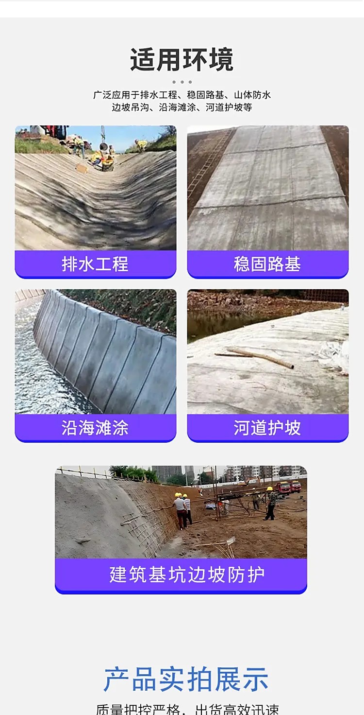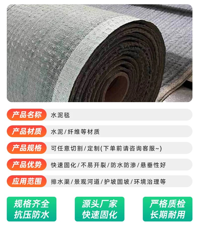 水泥毯适用于各种水利工程如河道、渠道护坡、水、池塘防渗、堤坝抢险,以及鱼塘、蓄水池衬砌防渗,垃圾填埋场防渗、公路、铁路边坡防护、临时道路、路面快速修补、边坡绿化基底,抗洪、地震后临时构筑物加固等。