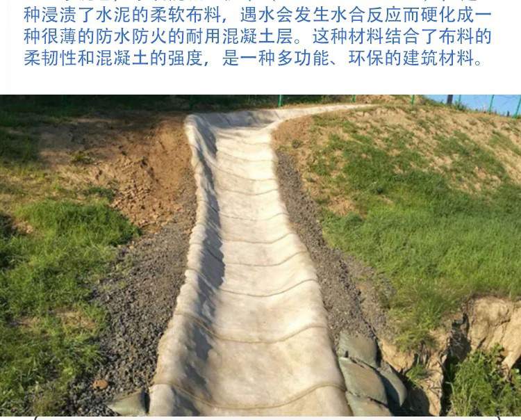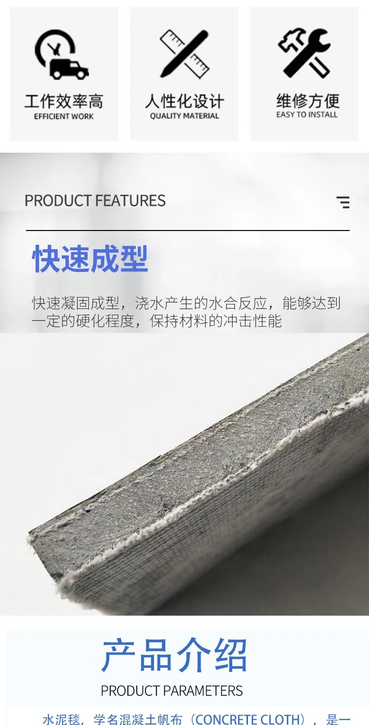 水泥毯成卷运输,人工即可装卸铺设,无需大型机械和现场搅拌混凝土,大幅缩短工期、降低成本;适合偏远山区、复杂地形。