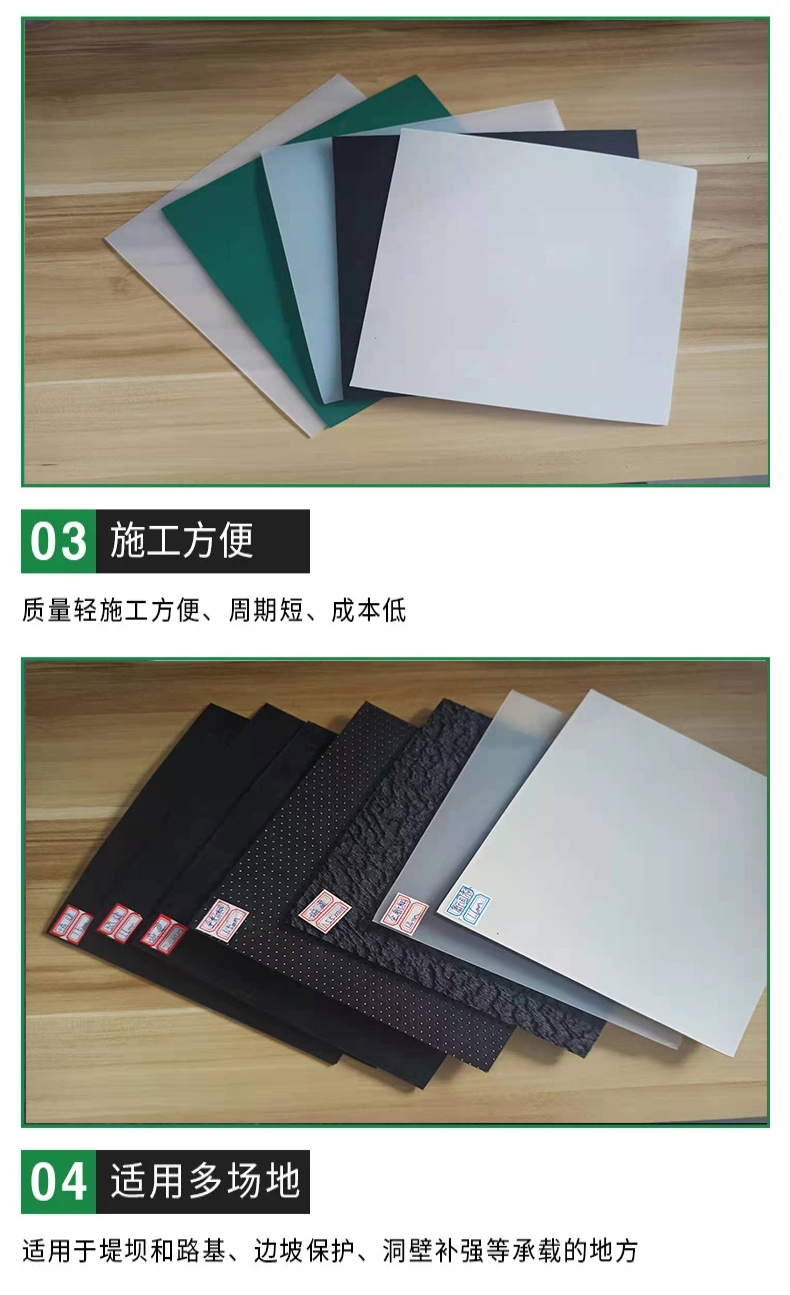 4、土工膜具有很高的抗张力强度,使它具有很高的抗拉强度能满足高标准工程项目需要。